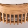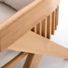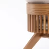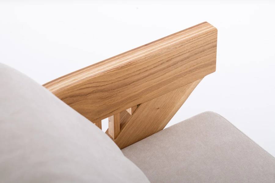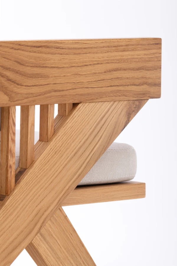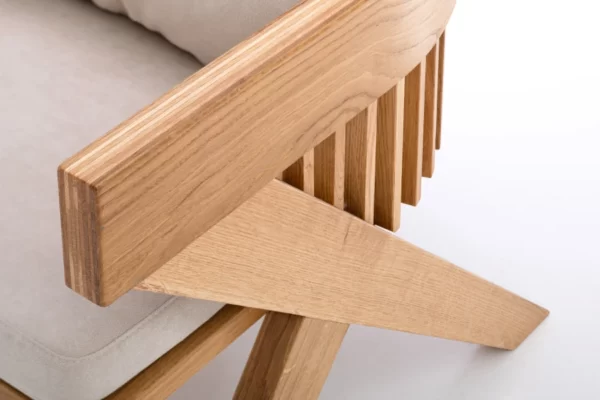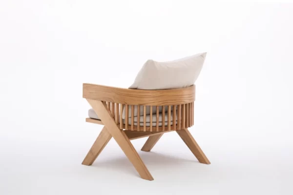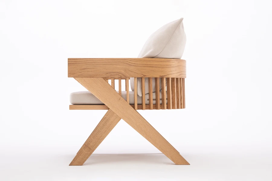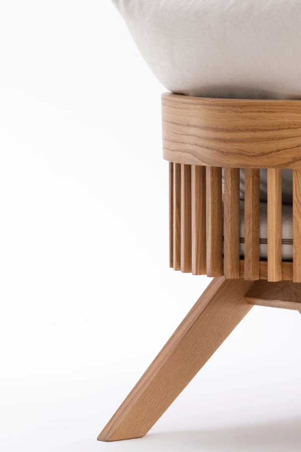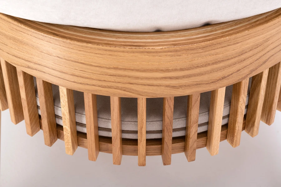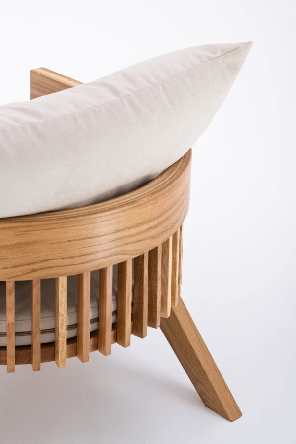 The design of this piece of furniture is a striking contrast of angles and curves. The sturdy base is angular, while the backrest is rounded for a comfortable embrace. Vertical slats wrap around the seat, creating a visually appealing rhythm and a sense of lightness.