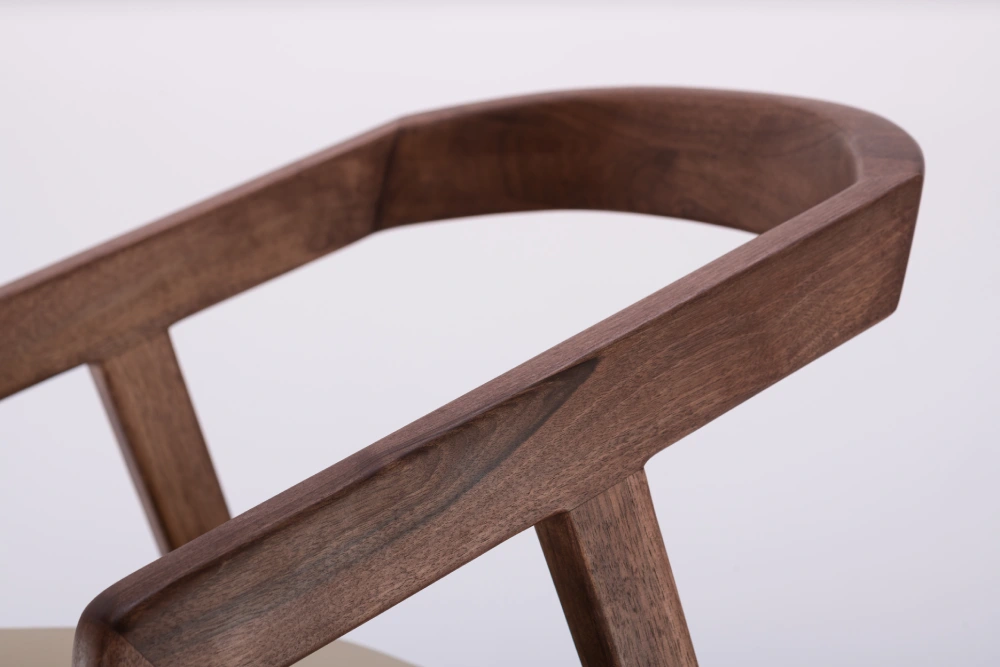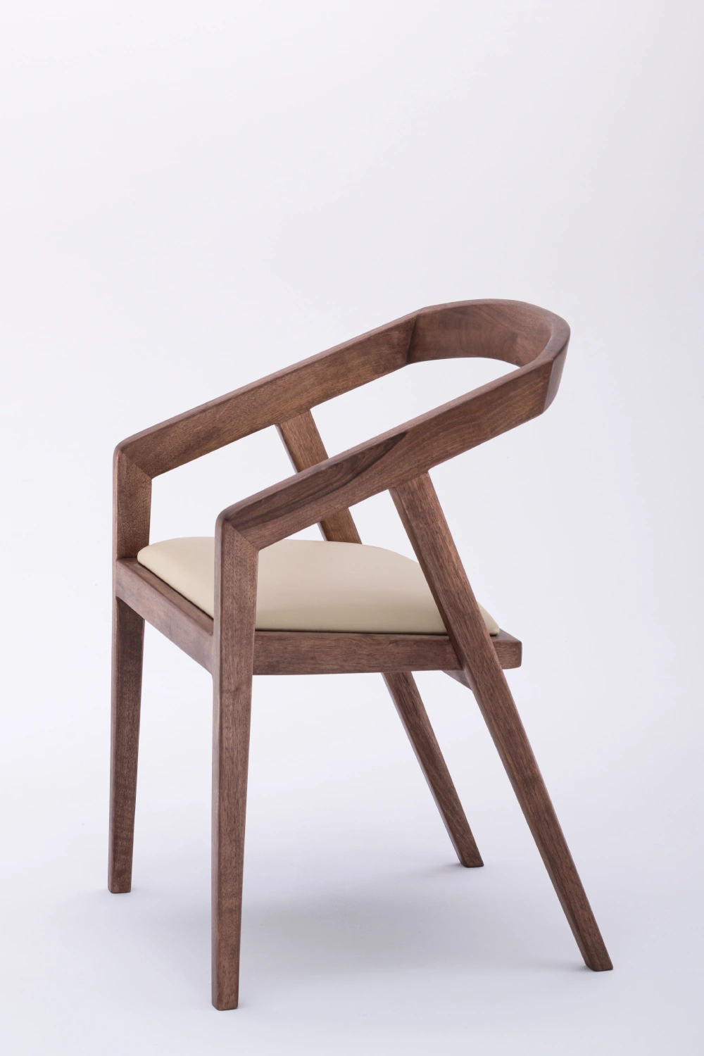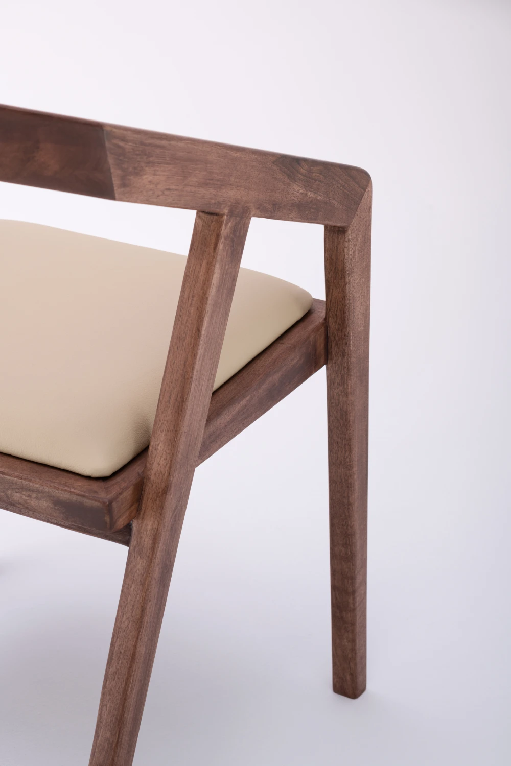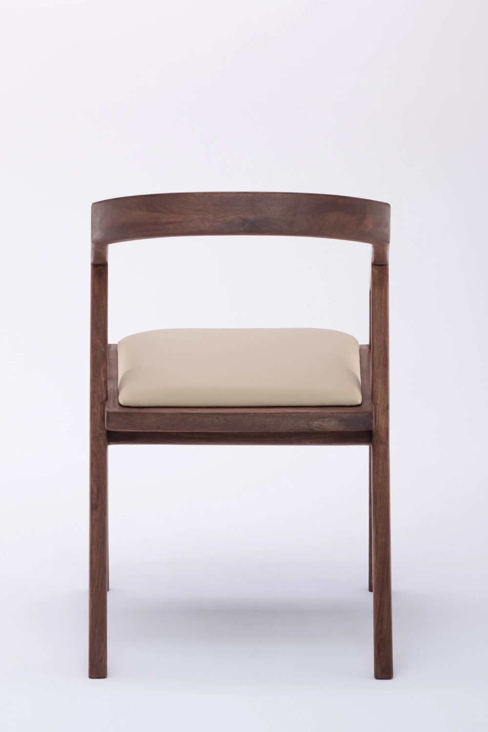 Nuda is a wide, laid-back solid hardwood handcrafted artisan chair designed with comfort in mind. Its refined form, which nods to mid-century modern Scandinavian design, is distinguished by a graceful solid wood frame that seamlessly blends arm support, backrest, and legs. A gently angled seat invites the user to lean back and relax while the leather-upholstered seat pad persuades them to linger a while longer. Nuda’s versatile design enables it to function as a lounge, desk, or dining chair that pairs perfectly with Moku’s Yorick dining table.